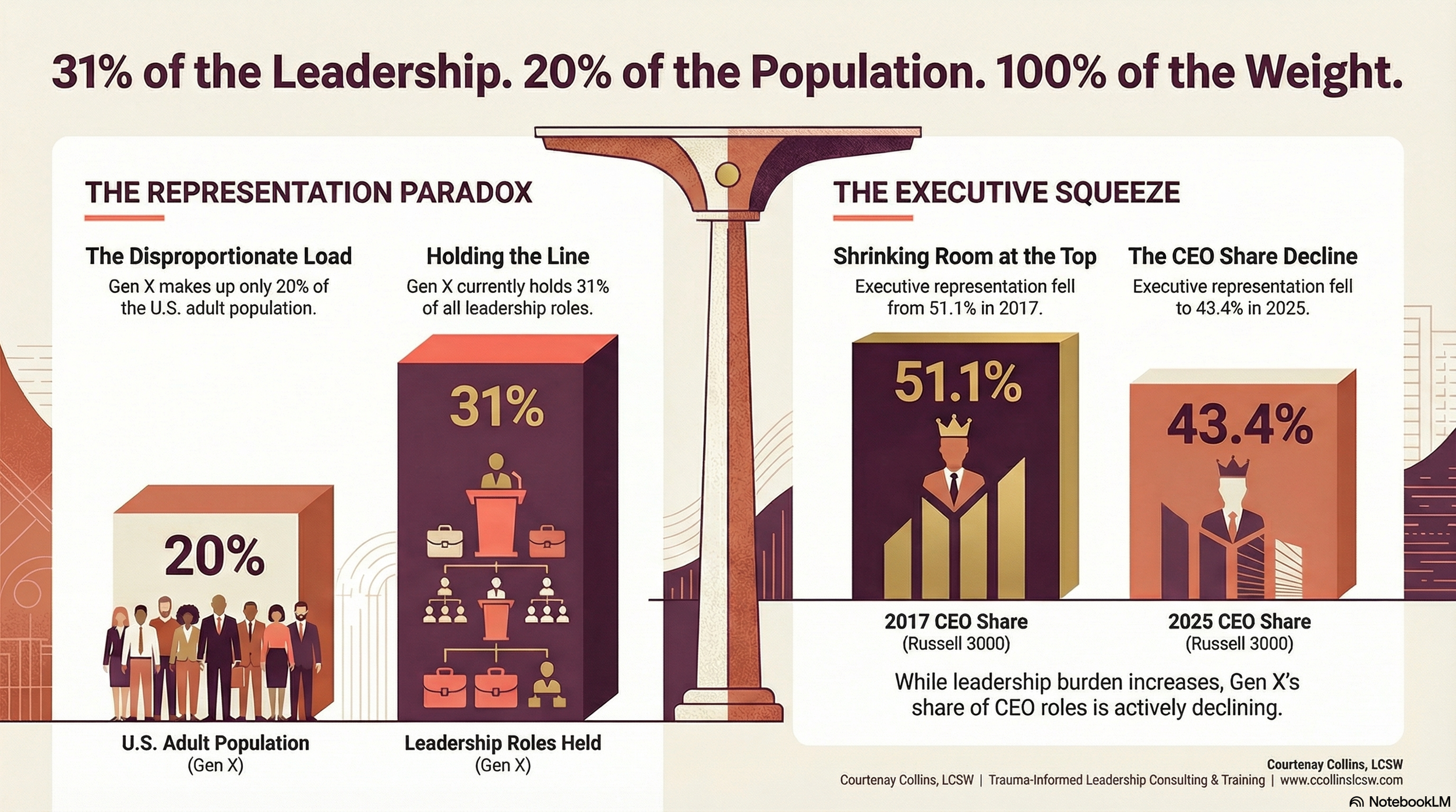 Here is a number worth sitting with: Gen X represents approximately 20% of the U.S. adult population but currently holds 31% of leadership roles, according to Solsten's 2025 generational data. That is not a sign of dominance. That is a sign of a generation doing disproportionate organizational work — again.