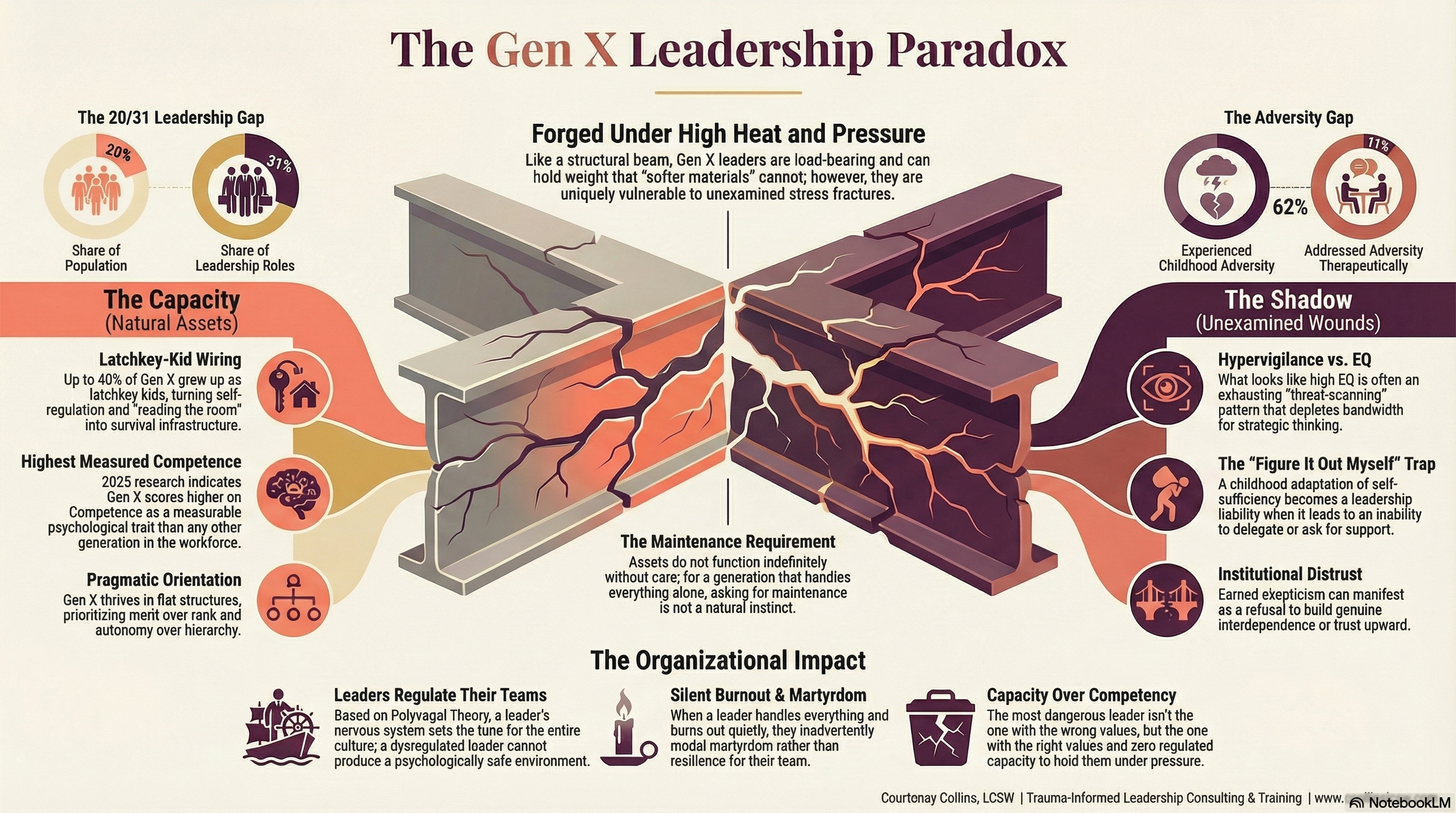 Gen X leaders are that beam. The adversity, self-reliance, and earned skepticism of institutions that shaped them in childhood are genuine organizational assets. But assets do not function indefinitely without maintenance. And for a generation that learned early to handle everything alone, asking for that maintenance often does not come naturally.