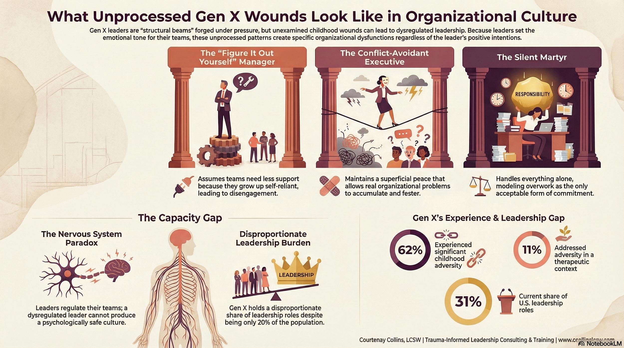 A dysregulated Gen X leader — one whose unexamined hypervigilance, conflict avoidance, or "figure it out yourself" orientation is running the culture — does not produce a psychologically safe organization, regardless of how much they value psychological safety. As Courtenay Collins, LCSW, who brings 25+ years of clinical trauma expertise to this work, states directly: "The most dangerous Gen X leader isn't the one who leads like a Boomer. It's the one who has all the right values and zero regulated capacity to hold them under pressure."