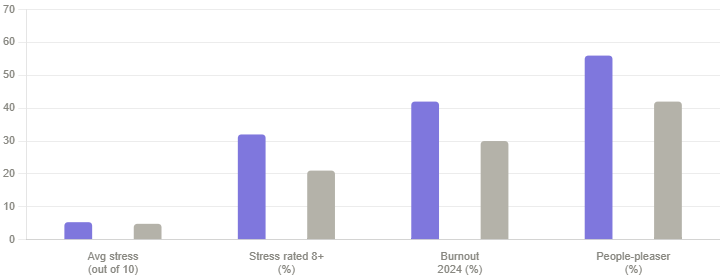 Average stress score (out of 10): women 5.3, men 4.8 — APA Stress in America. Women reporting stress level of 8+: 32% vs 21% of men. Female burnout rate 2024: 42% (up 4 pts); male burnout rate: 30% (down 3 pts) — State of Workplace Burnout 2024. Women identifying as people-pleasers: 56% vs 42% of men — YouGov. Women - Purple | Men - Gray